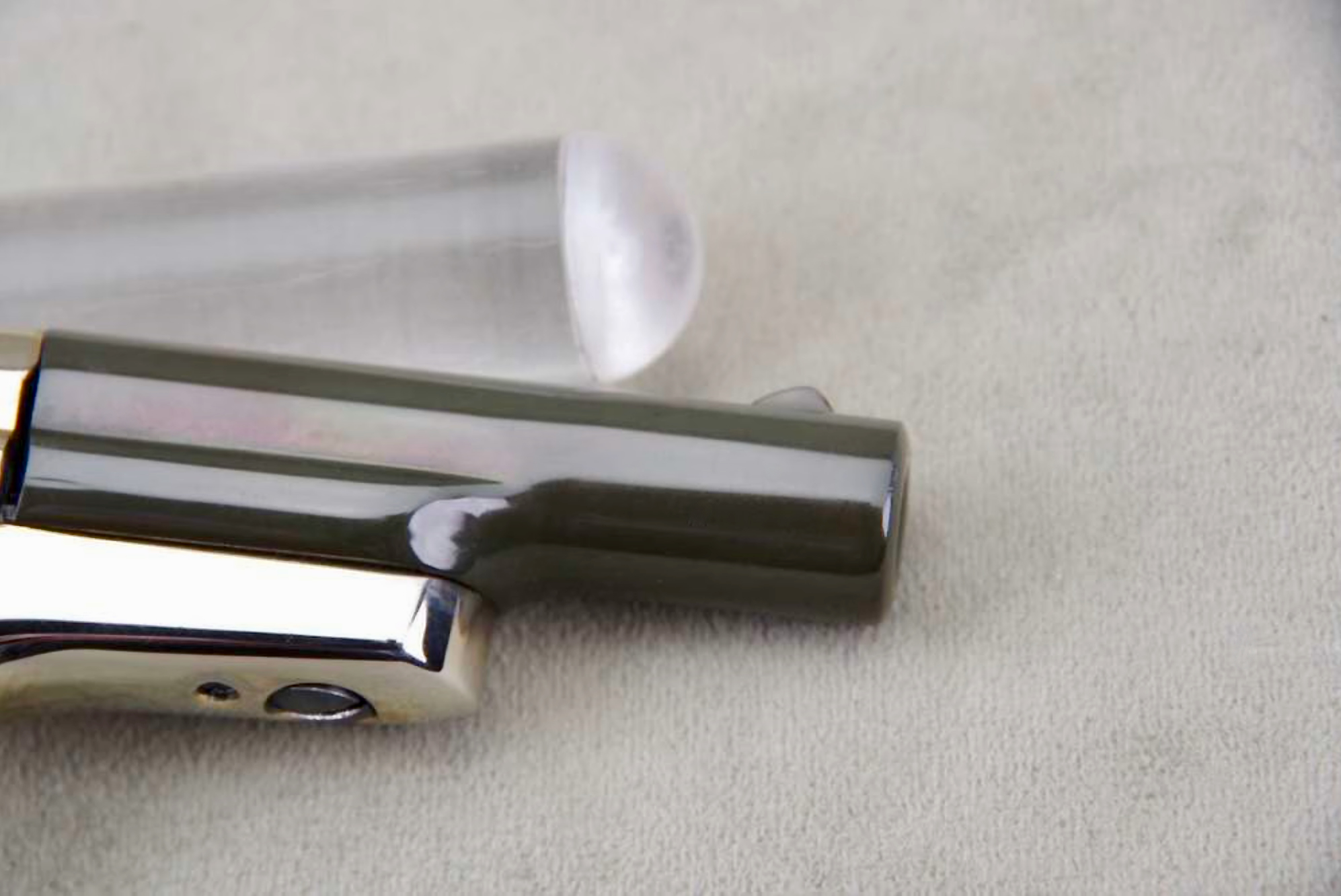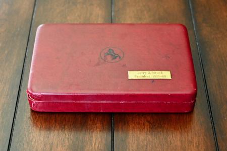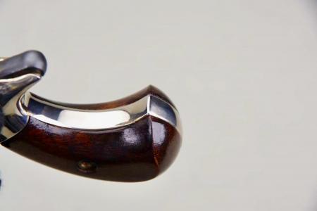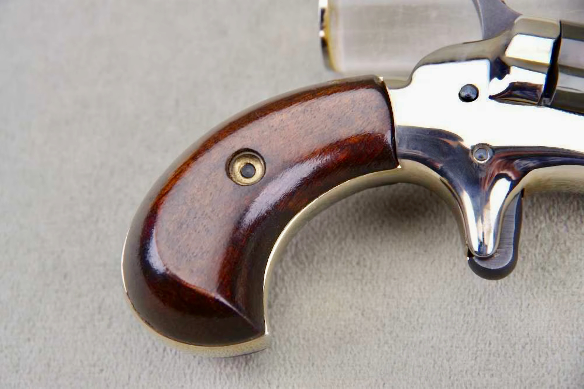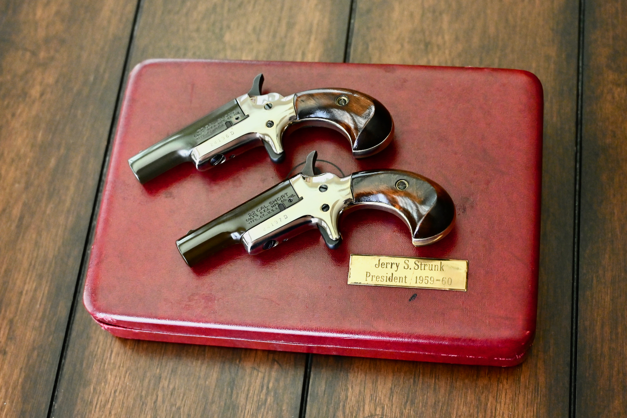 Both of these pistols remain in very high condition, and I would rate them at a strong 99%. The factory smooth walnut grips remain in near ‘perfect’ condition on both pistols. Additionally, the bores are bright & shiny w/ strong lands and grooves. The package includes the factory Colt display case w/ red lining, and an added plaque that reads Jerry S. Strunk President 1959-60. You rarely see 65-year-old Colt Derringers pop up for sale, especially in such amazing ‘like new’ condition, and especially w/ consecutive serial numbers!