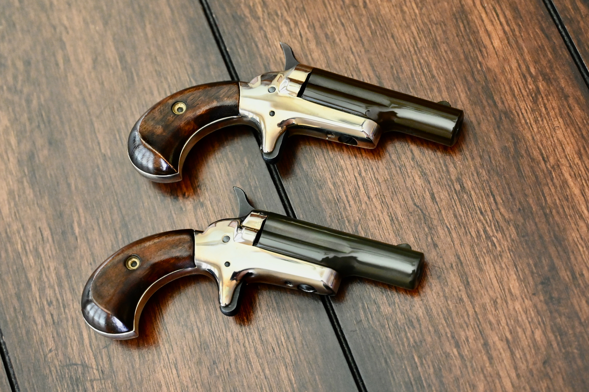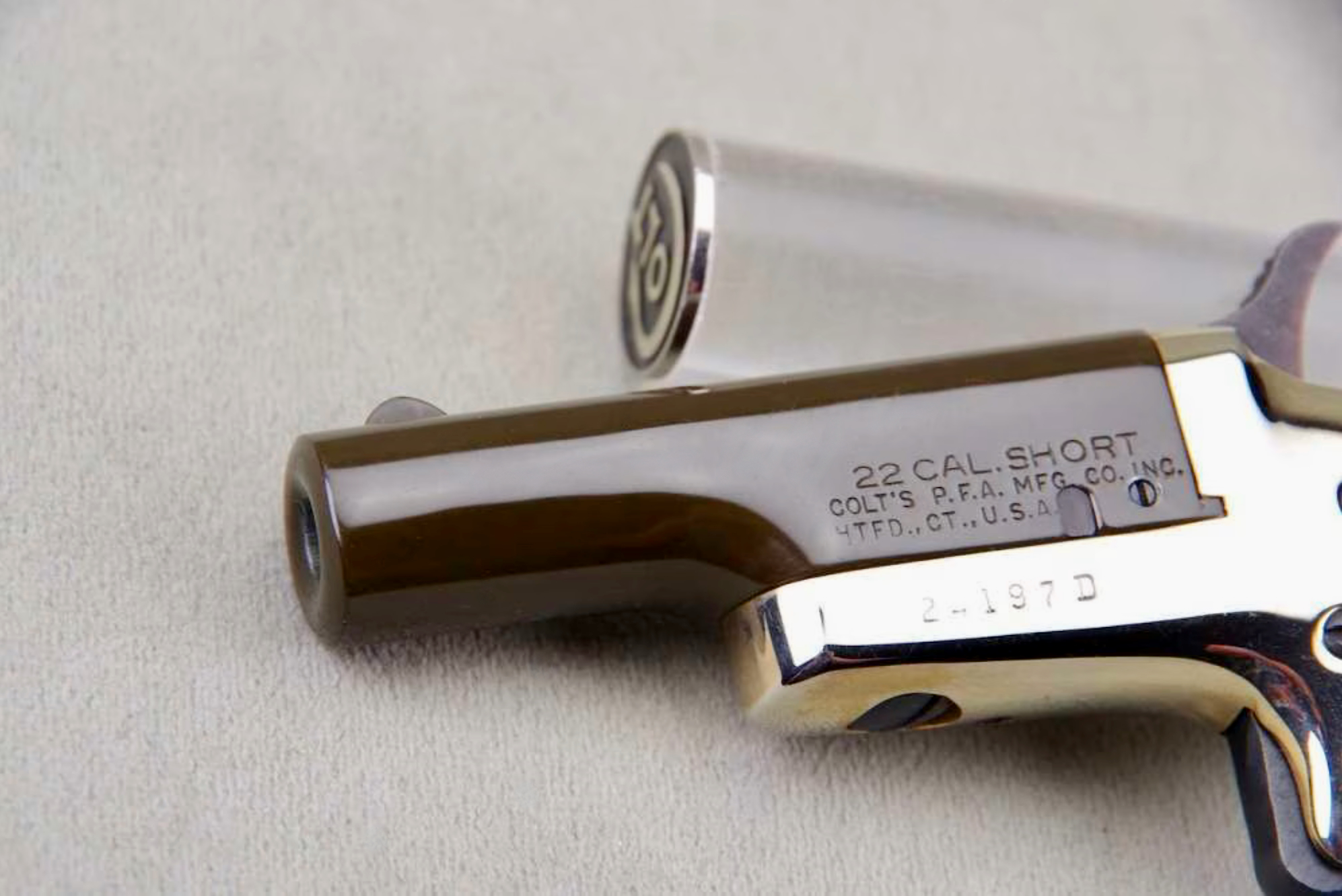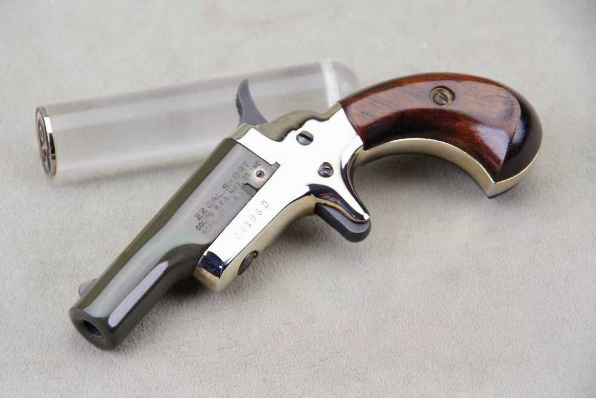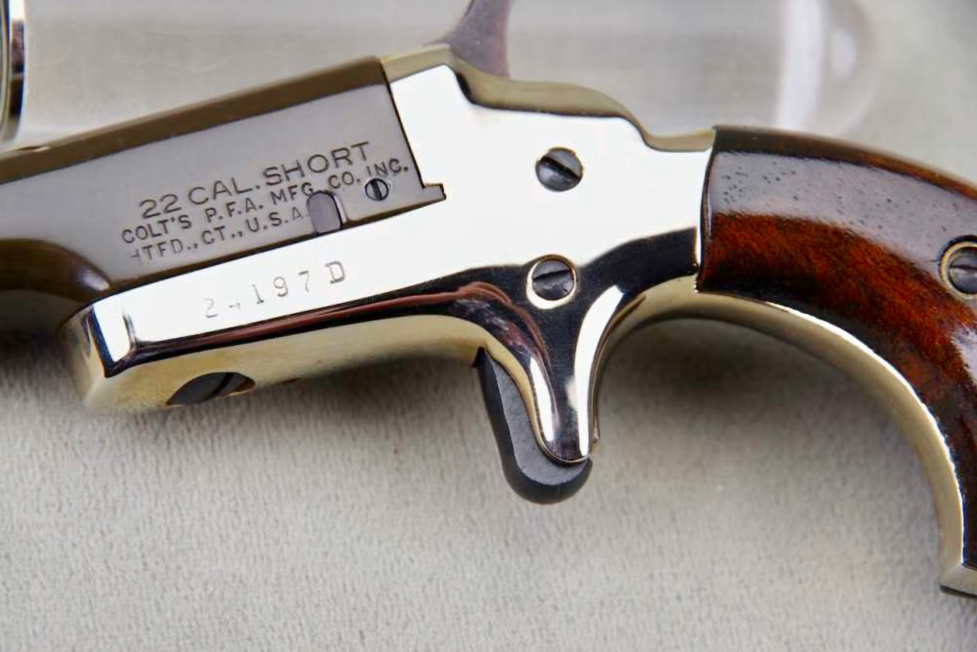 ‘Dirty Harry’ is very pleased to offer you this gorgeous set of (2) 1960 Colt Derringers, chambered in .22 short, and featuring consecutive serial numbers (24196D & 24197D). They are characterized by their gold-plated frames, 2 5/8” green patinated barrels, walnut grips, as well as their unique side pivot action and spur trigger. The 1960’s saw a specific iteration of the Colt Derringer, which was actually the Colt Fourth Model. These derringers, produced between 1959 and 1963, are chambered in .22 Short and were very popular among collectors and enthusiasts. According to the NRA, this particular model, identifiable by serial numbers ending in ‘D’, capitalized on the popularity of Westerns in the 1950s and 1960s.
