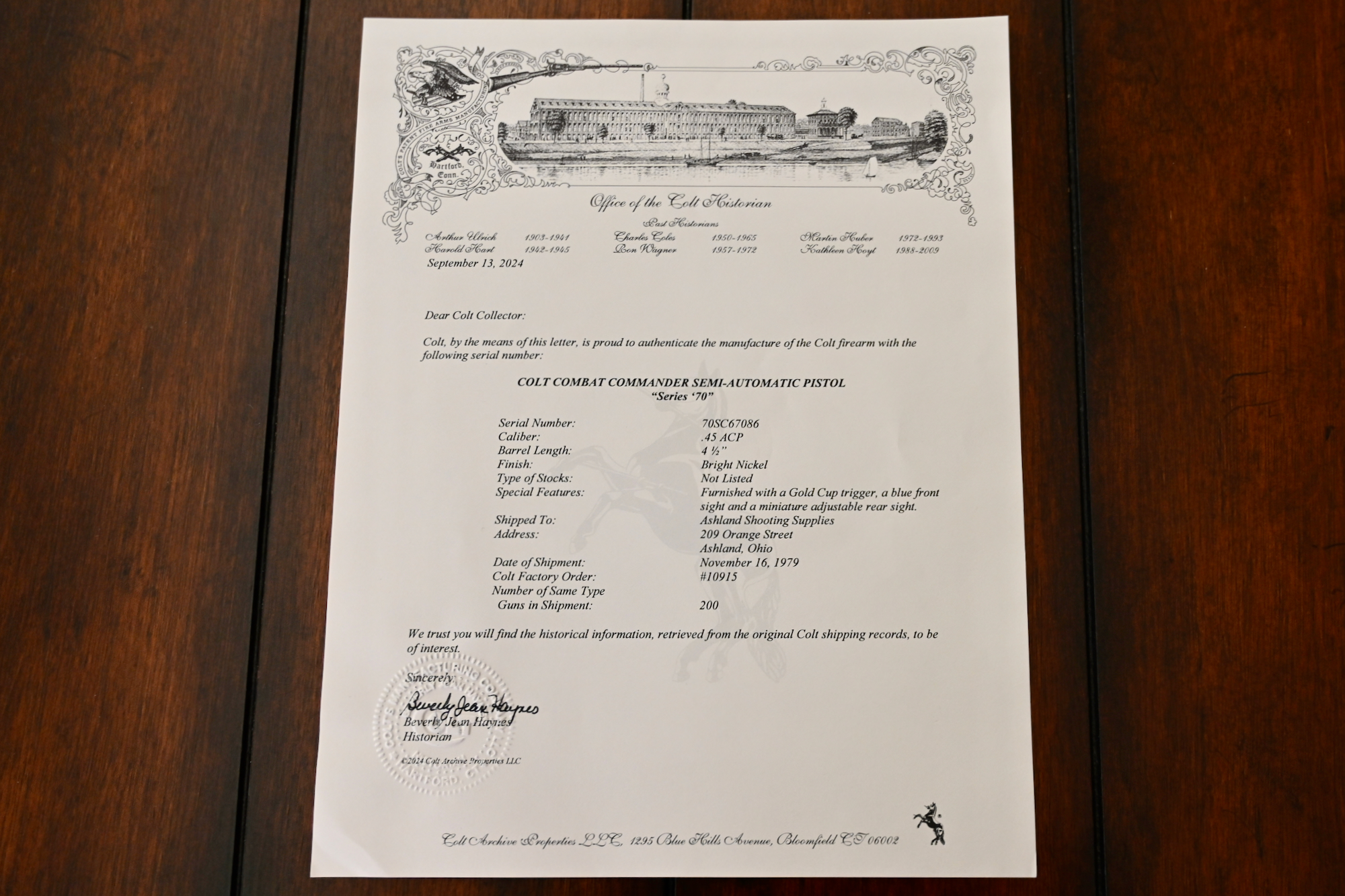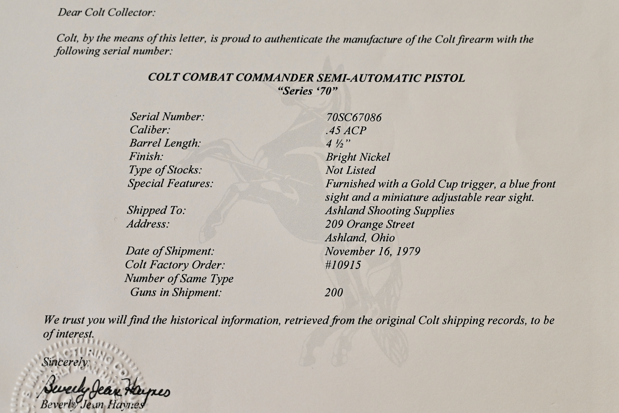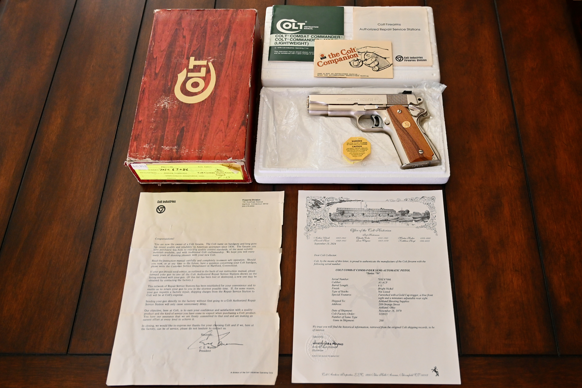 Overall condition is about as close to ‘new’ as you will ever find. The factory original bright nickel finish is bright & shiny like chrome, and the original checkered wood stocks w/ gold medallions are simply perfect. This pistol was shipped to Ashland Shooting Supplies in Ashland, Ohio, on November 16, 1979, and is one of 200 units produced in this specific configuration. The package is 100% complete, including the factory original Colt box w/ the Colt Custom Shop label (numbered to the gun), the factory original Colt paperwork, original Colt hang tag, as well as the Colt Archives letter.